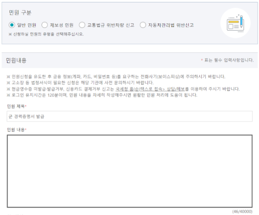 민원제목 - 군경력증명서 발급